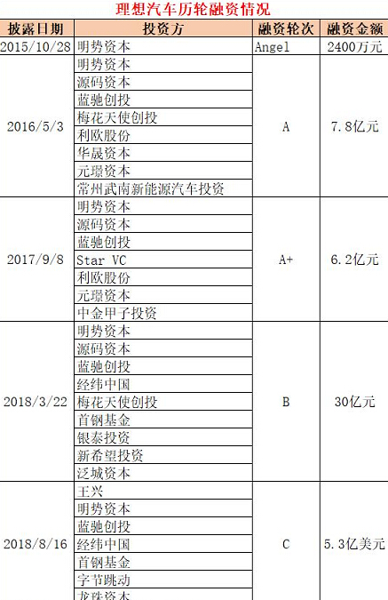 此輪融資后,理想汽車的累計融資額達到15.75億美元,投后估值約29.3億美元。從2015年至今,理想汽車經(jīng)歷了天使輪、A輪、A+輪、B輪以及C輪共5輪融資,估值迅速提升。以2016年5月上市公司利歐股份披露的投資公告來看,當時利歐股份對理想汽車投資3.5億元,獲得其11.75%股權(quán),以此估算,理想汽車當時估值約29.8億元。最新一輪融資后,其估值達到29.3億美元(約207億元人民幣),3年間估值增加了近6倍。而理想之家的每一輪融資,背后都不乏明星股東。據(jù)不完全統(tǒng)計,基金君將理想汽車歷輪融資情況梳理如下: