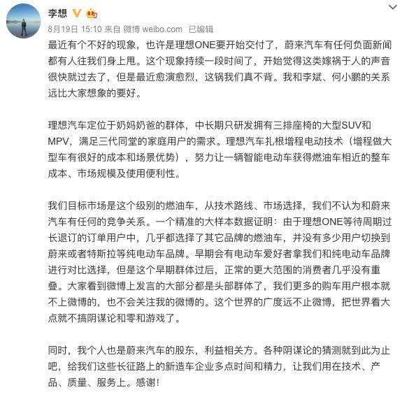 蔚來負面頻出,作為股東又疑似競爭對手的李想也被卷入輿論漩渦。8月19日李想發(fā)微博稱,最近有個不好的現(xiàn)象,蔚來汽車有任何負面新聞都有人往理想汽車身上甩,而且這種現(xiàn)象愈演愈烈,“這鍋我們真不背。”